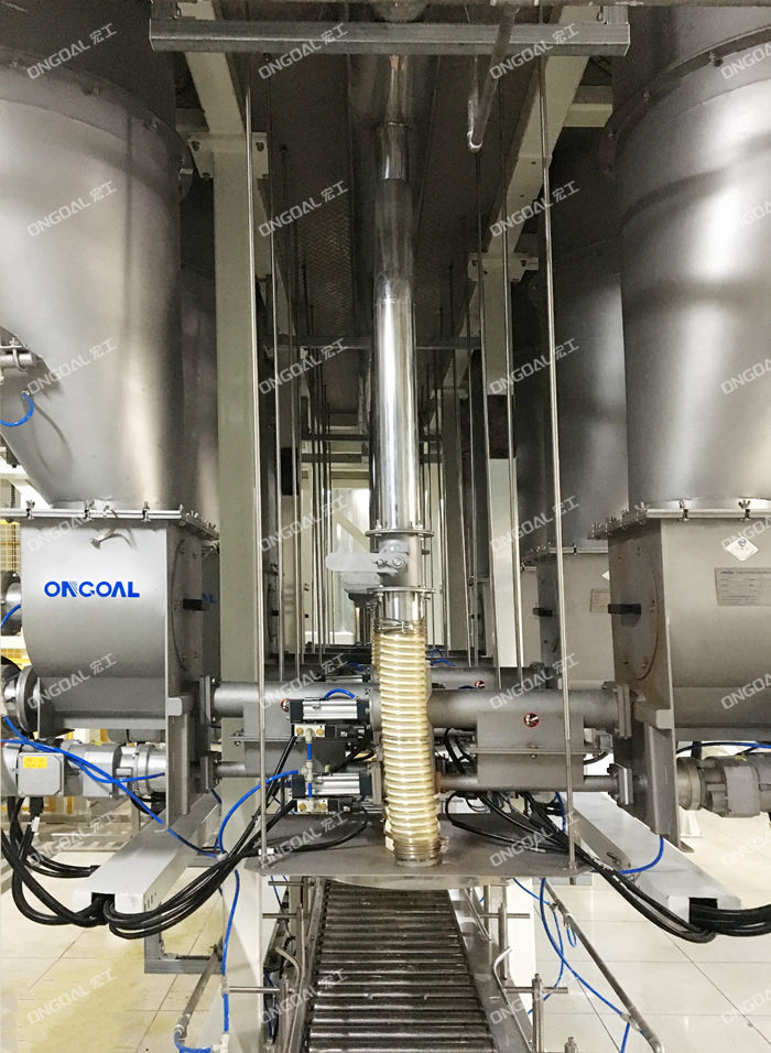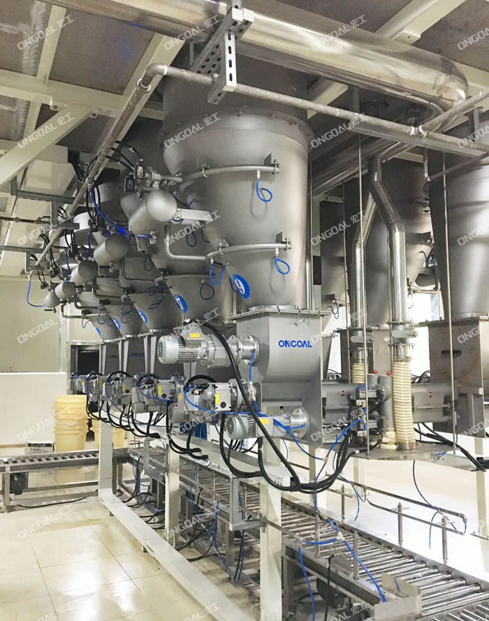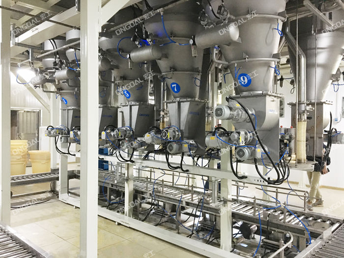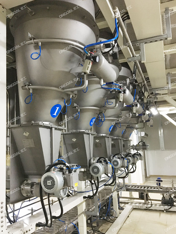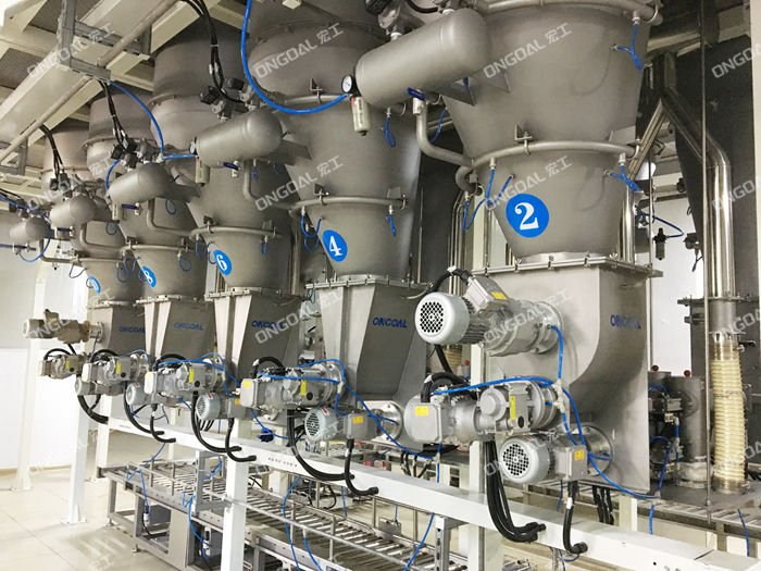 配料系统机组主要由多头螺杆喂料机、破拱装置、输送线、投料仓、升降式计量称、除尘装置、钢平台、提升机、控制系统组成。
